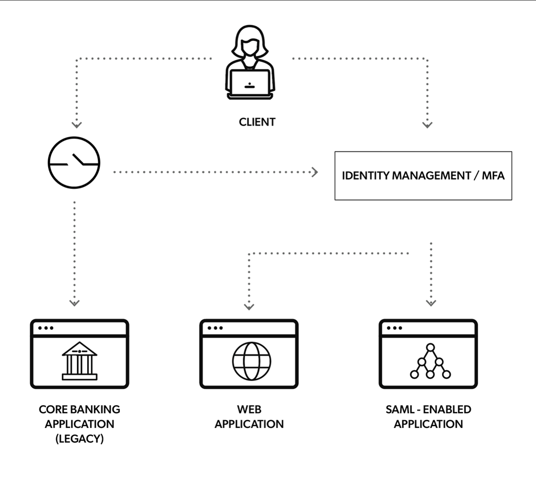 Here we illustrate how an employee of the financial services organization accesses a legacy application that cannot utilize SAML or MFA.