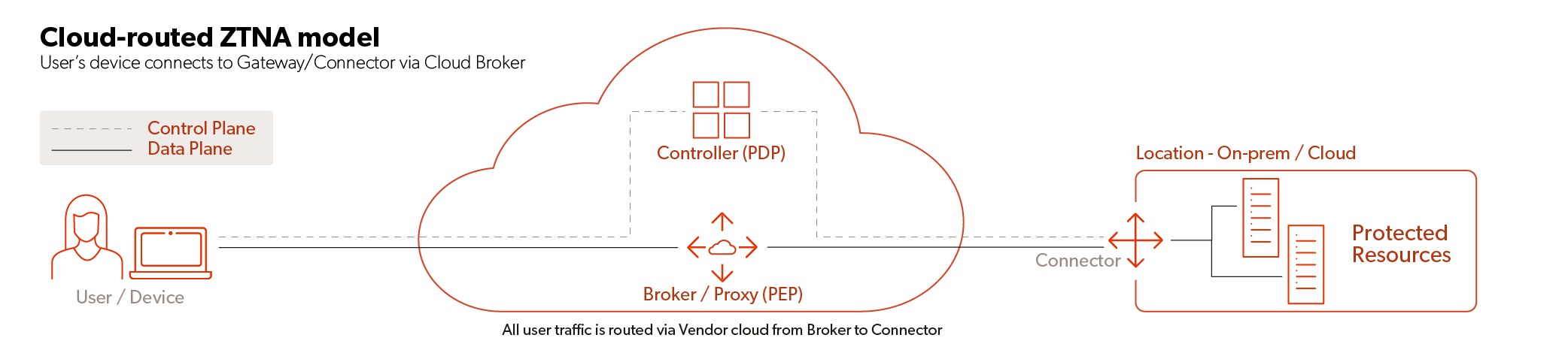 Let’s compare this to the direct-routed model. With this architecture, the vendor cloud is only used as a control plane. The data plane is never visible to, or accessible by, the vendor because enterprises deploy the vendor PEPs into their environments to run alongside their resources. Once authenticated, users obtain a security token that allows them to securely establish connections directly to the PEPs—hence the direct-routed name. Network traffic flows between the user device and the resource via the PEP. This minimizes network hops and reduces latency. Also, traffic routing is under control of the enterprise, allowing it to manage data residency requirements, for example.